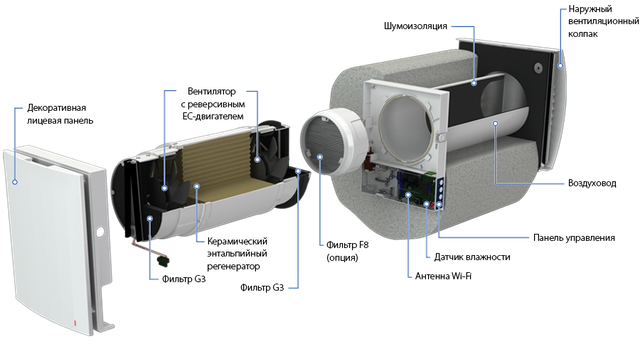 Спеціально спроектована лицьова панель забезпечує 100% герметичність і захист від вітру. Ефективна енергозберігаюча припливно-витяжна вентиляція квартир, приватних будинків, котеджів, соціальних і комерційних приміщень