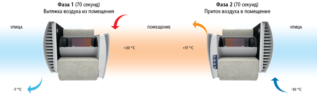 Забруднене тепле повітря витягується з приміщення на вулицю і проходячи через рекуператор, поступово нагріває його і передає частину вологи. Коли керамічний рекуператор нагрівся, установка автоматично перемикається в приплив повітря з вулиці.